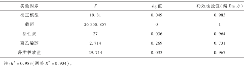 經過顯著性檢驗結果可以看出,PAC 和藻類投放量(C)的sig 值分別為0. 036 和0. 033,均小于0. 05,說明當SA 條件一定時,PAC 和C 對吸附重金屬Zn2 + 有顯著影響。這是由于鼠尾藻粉和活性炭粉都具有較好的親水能力,使水中的重金屬鋅能更有效的與鼠尾藻和活性炭進行吸附反應。PVA 對重金屬的吸附率影響不顯著。通過功效檢驗確定因素主次分別為C >PAC > PVA。對3 個因素水平進行SNK 多重比較結果,由表3 經過計算可以確定最大吸附率組合為PAC(1. 5)PVA(6)C(15)。