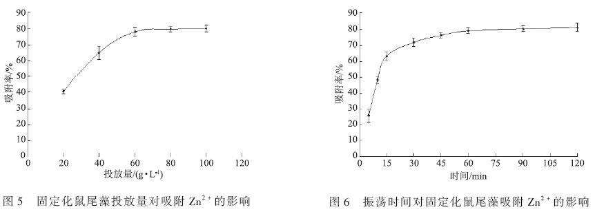 由圖6 可以看出:隨著時間的增加,吸附率的變化先快后慢,變化明顯。30 min 內由25. 6% 迅速提高到72. 1% ;在60 min 后吸附變化趨于平衡,120 min 時達到最大吸附率為81. 3% 。鼠尾藻粉吸附重金屬分為2 個過程:快速吸附過程與緩慢吸附過程,前期由于官能團裸露在表面,重金屬離子快速與官能團進行吸附作用,而緩慢吸附階段主要官能團表面大部分已被Zn2 + 占據,并與游離的Zn2 + 產生排斥作用,從而降低吸附速率。固定化顆粒吸附重金屬離子的過程主要是快速吸附過程,在較短的時間內快速達到吸附平衡。