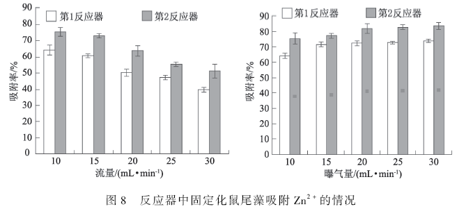從圖8 可以看出,在反應器運行的過程中通過調節流量,吸附率變化明顯。廢水經過第1 個反應器時,吸附效果不明顯,最高只能達到64% 。當廢水繼續經過第2 個的反應后,出水達到75% ,提高了10% 。如果流速降低則運行時間過長,效率降低;如果流速過快,則顆粒物不能和廢水充分反應,吸附率達不到理想的效果。由于模擬廢水處理過程中中不能實現振蕩吸附,效果相較于前面實驗結果略差。為了進一步提高吸附率,遂進行了曝氣處理,增加顆粒內水體的置換效率,達到更好的去除效果。在10 mL·min - 1 運行條件下,曝氣量由小變大,吸附率也由75. 5% 提高到83. 6% 。在曝氣量為30 mL·min - 1 后吸附率只提高了1. 5% ;故曝氣量為30 mL·min - 1 時,既能有較好的效果又能節約電能,同時相較于第1 個反應器出水情況,吸附率也提高了接近10% 。實驗表明,相較于單床反應器,多床反應器顯著的提高了出水水質,并且對Zn2 + 的吸附率要高于利用固定化生物活性炭與菌類的吸附率 。