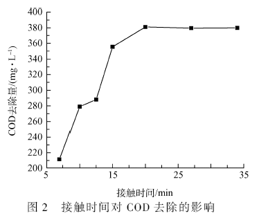 1) 接觸時間優化。在氣體臭氧濃度為22. 2mg·L - 1 ,進氣氣體流量為0. 3 L·min - 1 條件下連續運行裝置,保證相同的臭氧投加量300 mg·L - 1 ,調節接觸時間分別為7、10、13、15、20、27、34 min,比較在不同接觸時間下COD 的去除效果,ΔCOD 隨接觸時間的變化情況如圖2 所示。