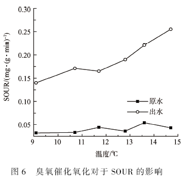 采用最優條件進行連續實驗:接觸時間為20min,臭氧投加量為200 mg·L - 1 ,在不同溫度下,以二級生化池的底泥對原水和出水分別進行活性污泥比耗氧速率(SOUR)的測定,結果可直接反映廢水是否適于后續二級生化處理,更具有實際應用價值,實驗結果見圖6。