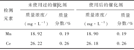 使用電感偶合等離子體發射光譜儀分析使用前后的催化劑,催化劑有效金屬元素為錳和鈰,對這2種金屬元素進行含量分析,結果見表5。