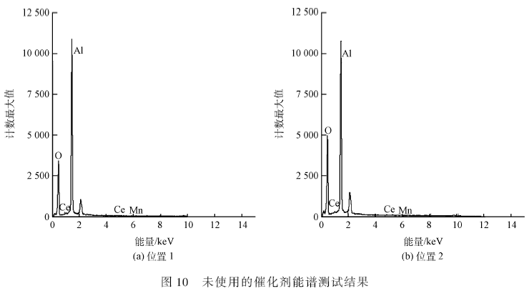 催化劑選用氧化鋁為載體,由表7 數據可以看出催化劑表面含大量Al、O 元素,而有效成分Mn、Ce 元素含量較少且不同位置含量有所差別,說明催化劑表面的活性組分負載并不均勻,日后可以改進完善催化劑制備方法。使用后的催化劑表面能檢測到微量的Na、Ca、Cl 等元素,可能是自廢水中吸附所得,因此建議催化劑在使用過程中定期沖洗以去除這些微量附著物,以免影響催化活性。