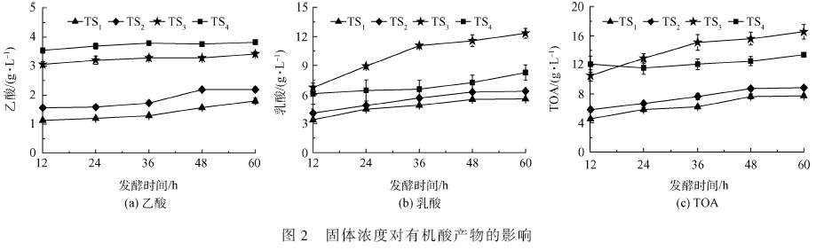 如圖2 所示,乳酸和乙酸是短程自由發酵過程中的2 種最主要的有機酸,占據了總有機酸(TOA)含量的90% 以上,并且在4 個固體濃度條件下,乳酸的含量都要比乙酸高。圖2(a)表明,乙酸含量隨著固體濃度增加而增加,在TS4 時乙酸有最大產值為3. 8 g·L - 1 ,這個結論與RAMOS 等[17] 的結論是一致的。但是乳酸的產量并沒有隨著固體濃度增加而直線增加(圖2(b)),乳酸的最高產量發生在TS3 條件下(12. 34g·L - 1 ),而并非TS4 條件下(8. 26 g·L - 1 ),但是RAMOS 等得到的結論卻是乳酸含量隨固體濃度增加而增加,在TS = 90 g·L - 1 時乳酸產量有最大值,這種差異性是由于發酵類型的不同而導致的,根據前面對單相厭氧發酵的分類,本研究中的TS2 、TS3 、和TS4 都屬于半干式發酵,而RAMOS 等[17] 的實驗中TS = 1、5、10、40 和90 g·L - 1 應該屬于濕式發酵,因此可以看出,不同的發酵類型對不同有機酸產量影響不同。