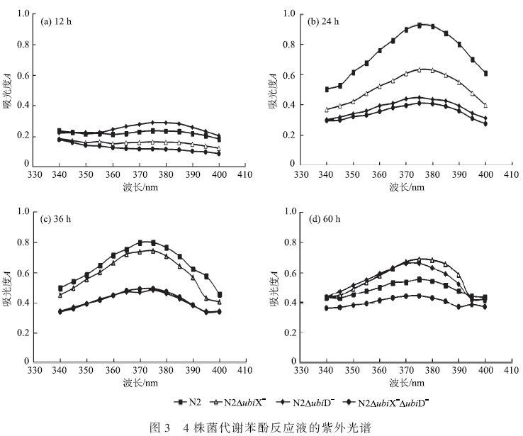 由圖3 可知,4 株菌生長至12 h 時,降解液在375 nm 處的吸收峰很小,即鄰苯二酚間位開環(huán)裂解產物2-HMS 的積累量很少。而當生長至24 h 時,降解液在375 nm 處吸收峰的峰值達到最大,即轉化產物2-HMS 的積累量達至最大值。由圖3(c)和圖3(d)可知,與24 h 相比,生長至36 h 和60 h 時,375 nm 處的吸收峰峰高降低,說明前期積累的2-HMS 被進一步分解為其他中間物質。按照文獻報道,2-HMS 最終可轉化為乙酸、丙酮酸等三羧酸循環(huán)的中間產物。生長至24 h 時,N2 菌株的2-HMS 積累量最大,含量用吸光度A 表示為0. 928,而3 株突變菌中,最易間位開環(huán)裂解的為突變N2ubiX - ,其吸光度A 可達到0. 632,而N2ubiD - 菌與N2ubiX - ubiD - 菌在375 nm 處的吸光度A 相近,分別為0. 447 和0. 41;因此可以推測ubiX 基因不利于苯酚間位裂解。