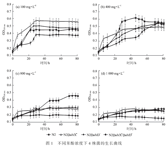 1. 2. 2 不同苯酚濃度對N2 菌及其突變株生長特性和開環(huán)裂解苯酚的影響實驗