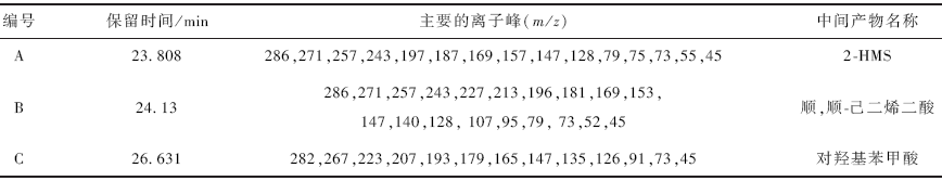 作為苯酚鄰/ 間位開環(huán)裂解產物,順,順-己二烯二酸和2-HMS 的質譜圖如圖4、圖5 所示。
