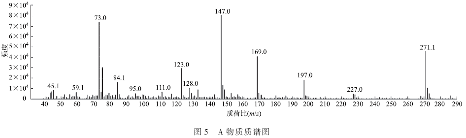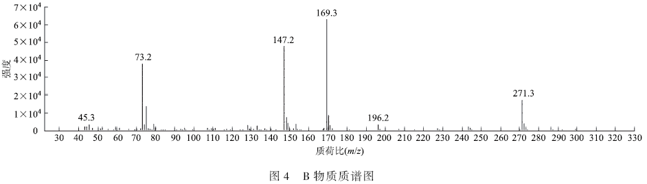由圖5 可知,該物質的分子離子峰M + m / z = 286,主要的碎片離子峰有m / z = 271,257,243,197,187,169,157,147,128, 79, 75, 73, 55, 45。M + - 15 [ CH3 ] = 271, 說明斷下了[ CH3 ] 碎片。M + - 117[—COOSi(CH3 )3 ] = 169,說明存在被衍生的羧基。而147 的存在說明被衍生2 次,即該結構中含有2 個羧基或1 個羧基和1 個羥基。M + - 257 = 29(CHO),M + - 68(OHCCH=CHCH) - 15[CH3 ] + 1[H] =204,M + - 68(OHCCH =CHCH) - 117[—COOSi(CH3 )3 ] = 89[O—Si(CH3 )3 ]。綜上可以推測出此物質為2-HMS。具體參見污水寶商城資料或http://www.bnynw.com更多相關技術文檔。