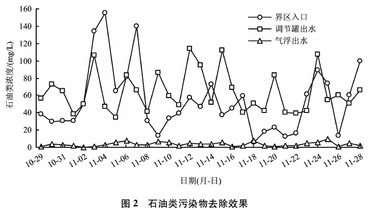 污水處理廠界區(qū)入口處石油類污染物的平均濃度為 53.74mg/L,最大值為 155.00mg/L;經(jīng)調(diào)節(jié)罐隔油處理后,石油類污染物的平均濃度為 63.77mg/L,最大值為 114.00mg/L;經(jīng)斜板隔油—兩級(jí)氣浮后,出水石油類污染物的平均濃度為 3.57mg/L,最大值為 9.36mg/L。各處理單元石油類污染物監(jiān)測(cè)指標(biāo)見圖 2。由圖 2可知,石油類污染物可達(dá)標(biāo)排放。