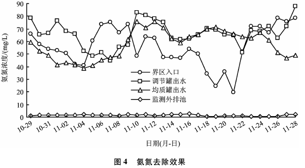 污水處理廠界區(qū)入口處 COD的平均值為3887mg/L,最大值為 6631mg/L;經(jīng)隔油處理、均質(zhì)調(diào)節(jié)后,COD的平均值為1947mg/L,最大值為2268mg/L;經(jīng) A2O生化池 +MBR+臭氧氧化后,COD的平均值為 107mg/L,最大值為 139mg/L。各處理單元氨氮監(jiān)測(cè)指標(biāo)見圖 3。由圖 3可知,進(jìn)水 COD大幅超設(shè)計(jì)標(biāo)準(zhǔn),處理后污水不能達(dá)標(biāo)排放。