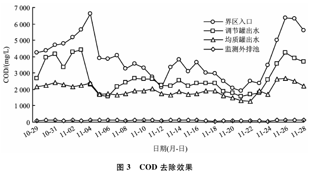 由圖 12可知,升級(jí)改造后調(diào)節(jié)罐出水 COD平均值為 4073.5mg/L,最大值為 5395.0mg/L;經(jīng)曝氣生物濾池好氧氧化后出水 COD平均值為 902.5mg/L,最 大 值 為 1790.0 mg/L,COD 去 除 率 為77.8%;經(jīng)水解酸化后出水 COD平均值為 598.0mg/L,最大值為765.0mg/L,COD去除率為33.7%。