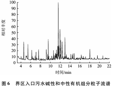 界區(qū)入口污水酸性及堿性、中性萃取物的 GC/MS分析結(jié)果見圖 5和圖 6。由圖 5和圖 6可知,其主要污染物為環(huán)烷酸、低級(jí)脂肪酸、含氮雜環(huán)化合物及苯酚類化合物。