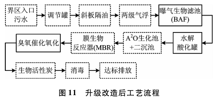 根據(jù)文獻(xiàn)資料并結(jié)合項(xiàng)目現(xiàn)場(chǎng)開展的中試試驗(yàn)結(jié)果,確定本次升級(jí)改造工藝:界區(qū)入口污水經(jīng)原有調(diào)節(jié)罐調(diào)節(jié),而后依次經(jīng)斜板隔油、兩級(jí)氣浮去除石油類;氣浮出水經(jīng)泵提升至新增的 BAF,其出水經(jīng)泵提升至升流式水解酸化罐(原均質(zhì)罐改造);水解酸化出水依次經(jīng)原有 A2O生化池、二沉池及 MBR;MBR出水經(jīng)泵提升至臭氧催化氧化塔(原臭氧氧化塔改造),其出水依次經(jīng)生物活性炭、消毒后達(dá)標(biāo)排放。升級(jí)改造后流程見圖 11。