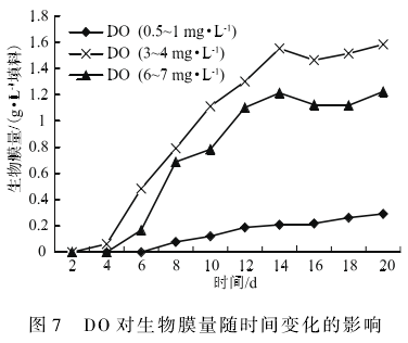 該組實驗在溫度為20一25℃、低負荷水質的條件下進行,主要研究曝氣所致溶解氧濃度變化對空心球掛膜的影響。如圖7所示,不同曝氣強度下,空心球掛膜的差異較大。溶解氧濃度維持在3一4 mg / L時,其膜增長速度快,所掛生物膜量大,掛膜良好。理論上,高溶解氧濃度有利于掛膜,但實驗結果表明,溶解氧維持在6一7 mg / L的反應器,其掛膜狀況較中等溶解氧濃度差,主要是因為高強度的曝氣雖然可以促進有機微生物的生長,但不利于微生物向填料表面富集,使填料表面掛膜過程難以啟動。而且曝氣強度過高,也會導致生物膜松散,易于脫落。溶解氧濃度為0. 5一1 mg / L的反應器填料生物膜量極少,是由于在該條件下,填料表面主要生長的為缺氧膜。由于實驗配制水樣為微污染水體,硝酸鹽濃度較低,不利于反硝化菌的生長繁殖,使該反應器的填料掛膜情況遠比另外兩組反應器差。