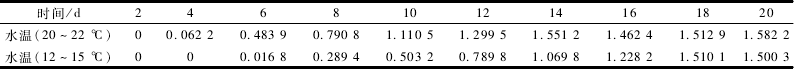 該組實驗在低負荷水質條件下進行。該組實驗是對比夏季和冬季兩組實驗的空心球填料掛膜情況。不同溫度區間范圍,空心球填料生物膜量隨時間的變化如表3所示。可以看出,水溫對掛膜的影響較大,尤其是掛膜的啟動階段。低水溫條件下,反應器掛膜啟動所需時間明顯延長,在第5天反應器水體才明顯可見渾濁現象,比水溫20 -22℃條件下延遲了3d。低溫條件下生物膜的增長速率也較慢,較高水溫下,掛膜階段生物膜的平均增長速率為0.149 g · /(L填料·d)^-1,低水溫下為0.124 g · /(L填料·d)^-1。掛膜時間也有所延長,低溫條件下達到最大生物膜量相比較多2d。對比2組實驗結果發現,其終期的生物膜量差別不大,說明水溫雖然影響掛膜過程,但對填料最終的單位面積的生物膜量影響不大。