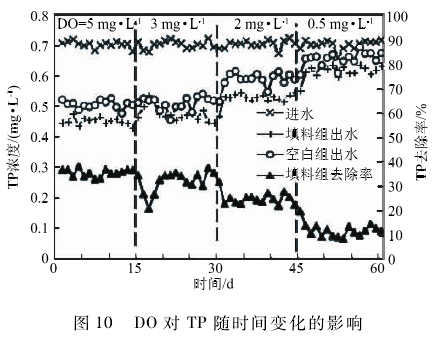 3)對TP的去除。從圖10中可以看出,溶解氧濃度越低,總磷的去除率也越低,4個階段總磷的去除率分別為35. 23% ,31. 62% ,23. 99%和11. 53%。在鄭作添研究球形填料的實驗中,其總磷的去除率可達75 %,對比本實驗,總磷的去除主要靠微生物的同化作用,并沒有去除底泥的過程,所以總磷的去除率總體不高,對于不依賴植物的浮島,單一的有機填料在自然狀態下除磷效果不好。溶解氧較高的條件下,好氧區好氧微生物大量繁殖,提高了通過同化作用吸收磷的能力。與缺氧微生物相比,好氧微生物具有生長率高、世代時間短等特點,所以,在同化作用除磷方面具有主要的影響。因此,隨著溶解氧濃度的降低,總磷的去除率也呈明顯下降趨勢。