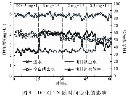 對比空白組出水和填料組出水的COD,氨氮,TN和TP濃度變化可以看出,空白組對于各指標的去除效果均較填料組差,所以在該實驗中,填料是除溶解氧外另一個污染物去除的關鍵因索。隨溶解氧濃度變化,空白組COD的濃度變化略有上升,并不明顯,說明溶解氧對COD的去除影響不大,填料所起的作用占主要地位。而對于氮磷的去除則受溶解氧影響較大。