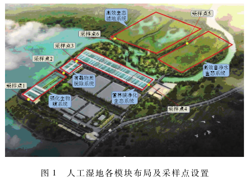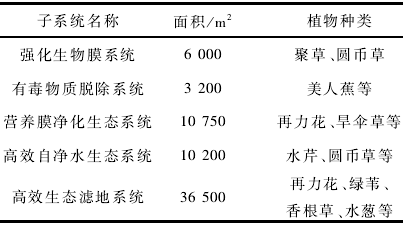 臨安城市污水處理廠位于青山湖旁,高效復合人工濕地系統建設在青山湖淹沒區,用于凈化臨安污水處理廠的尾水,復合人工濕地總面積達到66 650m2,系統水力停留時間為35 h。本濕地具有5個子生態系統(見圖1):強化生物膜系統、有毒物質高效脫除系統、營養膜凈化生態系統、高效自凈水生態系統和高效生態濾地系統。其中強化生物膜系統、有毒物質脫除系統和營養膜凈化生態系統建有大棚保護,這3個子系統組成大棚系統;高效自凈水系統和高效生態濾地系統組成露天系統。各模塊面積及所種植物如表1所示。