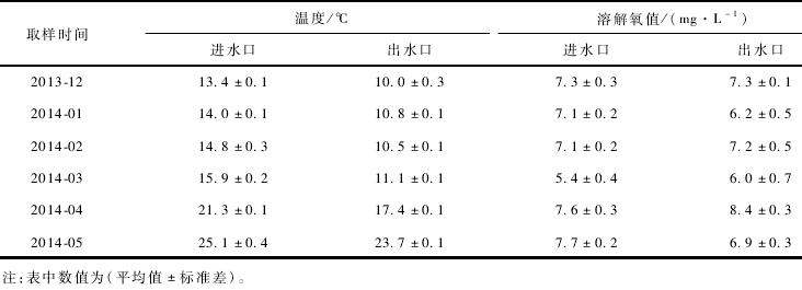 本實驗進行時I司為2013年12月一2014年5月,每月采集濕地水樣,采樣點設置在每個子系統的進水日和出水日,共計6個采樣點。上午11點左右,用連接橡皮管的注射器采集樣品。采樣的同時使用溶解氧儀測定溫度和溶解氧,每個點采集3個重復。水樣采集后放于4℃冰箱保存待測。