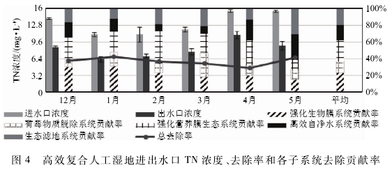 人工濕地對氮的去除主要是依靠植物吸收和微生物硝化反硝化作用。在冬季,由于植物枯萎,微生物活性降低甚至停止活動,人工濕地對氮的去除率始終較低。研究表明,硝化反硝化細菌最適宜活動溫度在30℃左右,而在5℃以下,硝化反硝化細菌活動基本停止。本高效復合人工濕地系統由于大棚保護等的作用,為反硝化細菌創造了很好的溫度環境,從而促進了尾水低溫季節氨氮和硝態氮的去除效果。由于本濕地進水總氮以氨氮和硝態氮為主,因此,總氮的去除率在低溫的12月一次年2月仍然在40%左右,略高于溫度較高的3月一5月。