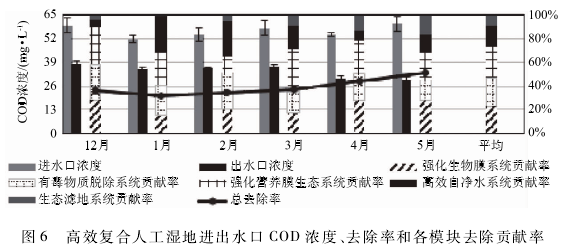 而進水口COD相對較穩定,變化在51. 55 -59. 98mg / L,出水口為29. 58 -37. 97mg / L(見圖6)。去除率從1月份的最低32%有逐月增加的趨勢,到5月去除率高達51%,即COD的去除效果有隨著溫度上升而加強的趨勢。COD的去除貢獻率最高的是強化營養膜生態系統,為27 %;生態濾地系統的平均貢獻率最低,僅9%。前3個模塊對COD的去除貢獻率相對平均,后2個系統平均貢獻率較低。大棚系統在12月貢獻率最高,高達91%,在2月貢獻率最低,為65 %