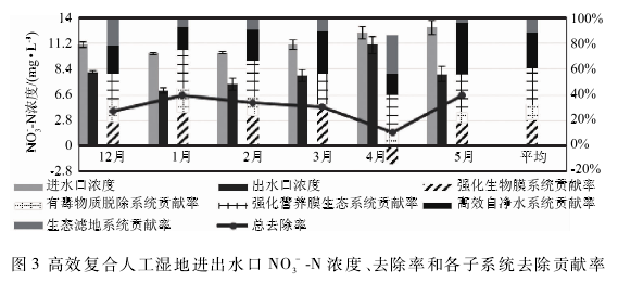 硝態氮的濃度變化比較穩定,進水口為10. 09一12.91 mg / L,出水口為6. 09一11. 03 mg / L'(見圖3)。濕地系統對硝態氮去除能力比較低,僅11% -39%(見圖3)。對硝態氮的去除,各個子系統表現較為平均,面積較大的強化營養膜生態系統和高效自凈水系統去除貢獻率最高,約為28 %。而最后一個子系統生態濾地系統,平均去除率貢獻率最低,僅12%。其中,4月強化生物膜系統的去除率貢獻率為-18%,說明在經過該系統后,硝態氮濃度有所上升。大棚系統平均去除貢獻率仍然較高,平均為61% ; 1月去除貢獻率最高,為75% ,4月最低,去除貢獻率僅為36%。大棚系統在溫度較高的3 -5月去除貢獻率有所下降。