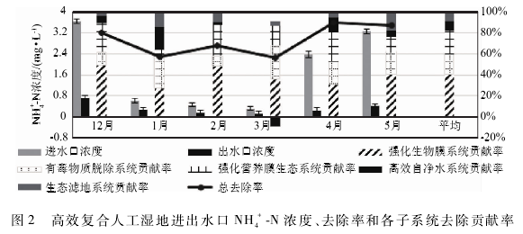 氨氮進水日濃度變化在0. 32 -3. 63 mg / L之間,12月份的進水日氨氮濃度最高,然后逐漸降低,在3月份達到最低,4-5月又呈現出上升趨勢(見圖2)。而總出水日氨氮濃度也與進水日表現出一致的變化趨勢,即最高和最低氨氮濃度分別出現在12月(0. 73 mg / L)和3月份(0. 14 mg / L)。總體來看氨氮的去除效果比較明顯,平均去除率達到75%左右。在各子系統中,強化生物膜系統對氨氮去除貢獻最高,平均去除貢獻率達到了40.7 %氨氮去除效果最差的是高效自凈水系統,平均去除貢獻率僅為8. 4%,在3月該子系統貢獻率為最低的一11.1%。而大棚系統包括強化生物膜系統、有毒物質脫除系統、強化營養膜生態系統3個子系統,對氨氮的去除起主要作用,平均去除貢獻率達到了84 %,在低溫的12月一次年3月大棚系統對氨氮的去除貢獻仍然維持較高水平,變化在64% - 89%之間。