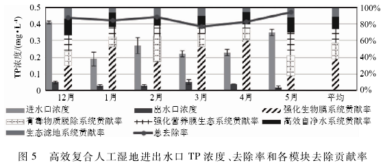 由圖5可知,本濕地總磷去除效果較好,進水口濃度為0. 19- 0. 41 mg / L,而出水口總磷濃度僅為0. 02 -0. mg / L,去除率為77%一94%。低溫季節12月一次年2月,去除率仍高于84 %。總磷的平均去除率貢獻率最高的是強化生物膜系統,為38%,最低為生態濾地系統,僅11%。整個濕地表現為越靠后的子系統去除貢獻率也越低。子系統去除貢獻率變化與溫度的升高并沒有明顯關系。大棚系統對磷的去除起到了主導作用,貢獻率為67%一80%。