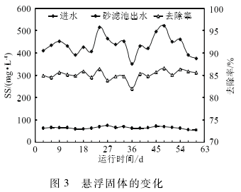 懸浮固體(SS)是污水治理的水質(zhì)指標(biāo)的一種,主要包括不溶于水中的泥沙、粘土、有機(jī)物和微生物等懸浮物質(zhì)。SS是導(dǎo)致土壤滲濾系統(tǒng)堵塞的主要原因,且其引發(fā)的堵塞過程較迅速且通常無法恢復(fù)。為了加強(qiáng)污水的預(yù)處理,本實(shí)驗(yàn)增設(shè)沉淀池、砂濾池環(huán)節(jié),通過沉淀池的沉降和砂濾池的截留來降低污水中55的濃度。砂濾池出水55的去除效果如圖3所示,其平均去除率達(dá)到85. 15 %,很大程度上緩解了后續(xù)土壤滲濾池得滲透壓力,同時(shí)經(jīng)過沉淀池、砂濾池的預(yù)處理之后,水體中污染物濃度也有所降低,使得后續(xù)土壤滲濾池的污染物負(fù)荷相對減小,水力負(fù)荷大為提高。SS進(jìn)水濃度在350.7-521.2 mg / L范圍內(nèi)變化,出水濃度能維持在80 mg / L以下,去除率也相對較穩(wěn)定。根據(jù)砂濾池出水的變化情況,大約平均每經(jīng)過17 d的運(yùn)行,對砂濾池進(jìn)行反沖洗操作一次,以保持其對污水中SS較高的去除效率。