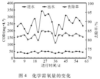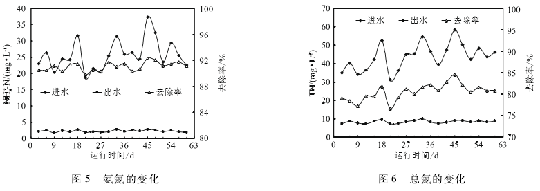 污水中的污染物可通過微生物降解、填料吸附等形式去除,其中微生物降解作用占主導(dǎo)地位。改良型土壤滲濾系統(tǒng)對農(nóng)家樂污水中的COD具有較好的處理效果,從圖4可以看出,系統(tǒng)出水COD平均去除率達(dá)到82. 41 %,且其基本能維持在50 mg / L以下,達(dá)到城鎮(zhèn)污水廠污染物排放一級A類標(biāo)準(zhǔn)。較高的去除率主要有兩方面原因:其一,污水進(jìn)入土壤滲濾池后,有機(jī)物首先與多孔球形塑料填料及沸石發(fā)生物理、化學(xué)吸附作用,同時(shí),由于多孔球形塑料填料具有豐富的內(nèi)表面,可為微生物的生長繁殖提供良好的生存環(huán)境,且該填料已提前進(jìn)行過掛膜處理,生物膜較厚,微生物數(shù)量多,加上持續(xù)的曝氣復(fù)氧,進(jìn)而可以保證其中的好氧/異樣型微生物等均能夠充分吸收污水中的有機(jī)營養(yǎng)物質(zhì)來維持自身的新陳代謝,從而使有機(jī)物得到分解利用;其二,當(dāng)污水依次流經(jīng)土壤段時(shí),厭氧型微生物也能利用部分有機(jī)物質(zhì)來充當(dāng)碳源,進(jìn)而保證反硝化過程進(jìn)行。期間進(jìn)水COD變化較大,在162. 4一341.6mg / L之間,最大濃度值出現(xiàn)在第24天,最小濃度值出現(xiàn)在第36天,這短時(shí)間內(nèi)的COD負(fù)荷大幅度變化對去除率沒有明顯的影響,系統(tǒng)仍保持較高的去除效率。這說明了系統(tǒng)具有較強(qiáng)的抗污染沖擊負(fù)荷能力。