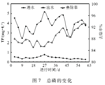 污水中的TP主要以有機(jī)態(tài)磷和磷酸鹽的形式存在。農(nóng)家樂污水中以顆粒形態(tài)存在的有機(jī)磷能夠很好的被系統(tǒng)中填料攔截、阻留,同時(shí)好氧區(qū)微生物能通過礦化作用等分解利用。該系統(tǒng)對污水中的磷酸鹽的去除,一方面是由于土壤中大量的Al,Fe和Ca等離子形成了土壤膠體顆粒,進(jìn)而通過物理吸附及較強(qiáng)的化學(xué)吸附去除污水中的磷酸鹽,同時(shí),沸石層添加的鐵屑,先被轉(zhuǎn)變?yōu)镕e2+,進(jìn)而被氧化成Fe3+,隨水流進(jìn)土壤填料層,進(jìn)一步形成Fe(OH)3,固定在土壤顆粒表面,從而吸附固定污水中的磷酸鹽,另外,好氧區(qū)的球形塑料填料和沸石也能吸附部分的磷酸鹽。由圖7看出,該系統(tǒng)對TP具有較好的去除效果,其出水濃度都保持在0. 8 mg / L以下,平均去除率達(dá)到88. 59%。此外,TP進(jìn)水濃度沒有明顯的變化規(guī)律,出水濃度有降低的趨勢,這可能是由于沸石層添加的鐵屑不斷的溶出Fe離子,使得土壤填料中Fe(OH)3膠體有所增加,提高了對TP的吸附效率。同時(shí),隨著好氧區(qū)聚磷菌的生長繁殖,其數(shù)量不斷增加,聚磷效果也越發(fā)明顯。針對傳統(tǒng)土壤滲濾系統(tǒng)出水磷溶出的問題,該系統(tǒng)通過鐵屑固磷技術(shù)大大延長了整個(gè)系統(tǒng)磷擊穿的時(shí)間。