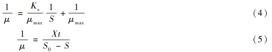在以厭氧反應器處理生物污水的過程中,建立動力學模型的目的是研究底物濃度、微生物質量濃度和底物降解速率等因素之間的關系,為實際應用提供理論依據。Monod 模型是用來描述細胞的比生長速率與限制性底物濃度的關系,選用該模型擬合污水處理中復雜有機基質的微生物生長動力學是較合理的。