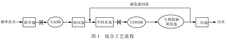 上流式厭氧污泥床(UASB)反應器是第二代廢水厭氧處理反應器,能利用厭氧微生物有效降解廢水中的大部分有機物并提高廢水的可生化性,具有結構緊湊、能耗低、處理負荷高、抗沖擊性好、產泥量少和產氣可資源化利用等優點 ;上流式反硝化污泥床(UDNSB)因其顆粒污泥沉降性能好,反應器污泥濃度高,從而可承受較高的處理負荷,并獲得良好的脫氮效果和穩定的出水水質,同時還可以大幅節省沉淀分離空間,是一種有廣泛應用前景的脫氮工藝,但目前在制革廢水處理方面相關的研究報導還比較少。另外,采用UDNSB 反應器與生物接觸氧化池的組合系統對制革廢水進行脫氮處理時,無需污泥回流裝置,不同的污泥處于各自的反應系統內,反硝化與硝化獨立進行,可以避免相互影響。針對制革廢水的特點及其傳統處理工藝中存在的問題,本研究結合上述反應器的優點,設計了以UASB、UDNSB 和生物接觸氧化池為代表的生物處理組合工藝,開展了近1 年的現場中試,考察了該工藝對實際制革廢水COD、NH4+ -N 和TN 的處理效果。