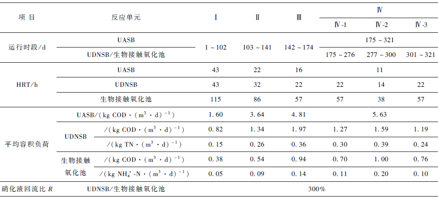 中試設計處理規模為1 m3 ·d - 1 ,采用連續進水的方式運行。在中試啟動階段,組合工藝的厭氧段(UASB 反應器)與缺氧段(UDNSB 反應器)所用污泥都取自當地某淀粉廠廢水處理設施UASB 反應器中的厭氧顆粒污泥,而好氧段(生物接觸氧化池)所用污泥則取自當地某城市污水處理廠氧化溝中的好氧活性污泥。實驗過程中控制進水的pH 值在7. 0 ~ 9. 0 之間,生物接觸氧化池的DO 濃度在3 ~ 4 mg·L - 1 之間,為避免冬季溫度過低影響實驗正常進行,通過安裝伴熱帶、溫度控制器及保溫層控制各反應器的溫度在(26 ± 3)℃ 。系統啟動完成后,根據各反應器的HRT 的不同,為期321 d 的中試實驗分為6 個運行階段,各階段的運行控制參數見表3。