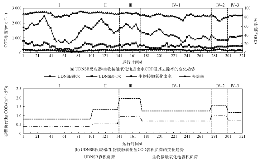 UASB 反應器在Ⅰ(1 ~ 102 d)、Ⅱ(103 ~ 141 d)、Ⅲ(142 ~ 174 d)和Ⅳ(175 ~ 321 d)4 個階段的運行中,進水量從250 L·d - 1 逐漸增加到1 000 L·d - 1 ,其HRT 則從43 h 縮短到11 h,平均容積負荷由1. 60 kg COD·(m3 ·d) - 1 提高到5. 63 kg COD·(m3 ·d) - 1 。