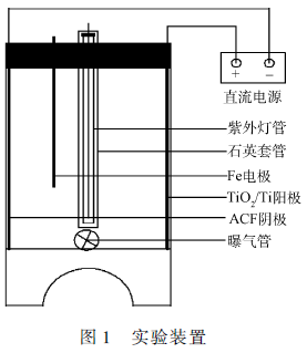 實驗裝置如圖1 所示,主要由直流電源、電極、低壓紫外汞燈、石英套管、反應器主體等部分組成。陰陽電極面積16. 0 cm × 25. 0 cm,陽極為實驗室采用溶膠凝膠法自制的TiO2 / Ti 電極板 ,陰極為縛在石墨板表面的活性炭纖維(ACF),極板間距6 cm,陰陽極間插入一塊5. 0 cm × 5. 0 cm 的Fe 板和一根3 cm 石英套管,15 W 的低壓紫外汞燈(G10q,佑威光電有限公司) 固定于套管中。反應中采用底部曝氣管曝氣,曝氣量由氣體流量計控制。電極工作電流由JS3010D 35 V/10A 直流穩壓電源(無錫安耐斯電子科技有限公司)提供。每組實驗電解處理液2 L,其中含有0. 5 mmol·L - 1 對苯二甲酸,20 mg·L - 1 硫酸鈉。pH 由0. 1 mol·L - 1 鹽酸和0. 1 mol·L - 1 的氫氧化鈉調節。