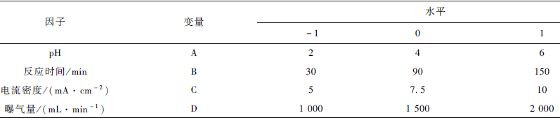 前期研究發現,PEF 中,溶液初始pH、反應時間、電流密度和曝氣量是直接影響·OH 生成量的主要因素。在單因素實驗研究基礎上,利用Design Expert 8. 0. 6 軟件的Box-Behnken Design (BBD)原理,以初始pH、反應時間、電流密度和曝氣量為影響因子,分別記為A、B、C、D,以2-羥基對苯二甲酸的特征熒光峰強度為響應值,記為Y,設計實驗方案。實驗因素水平和編碼見表1。