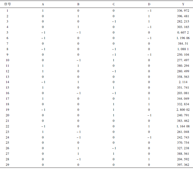 根據表1 實驗因素水平和編碼,設計了29 組實驗,每組實驗設置3 組平行,結果取其平均值。實驗條件及結果如表2 所示。