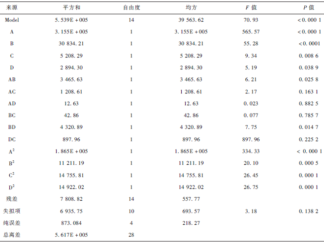 模型方程的相關系數R2 可以衡量模型的好壞,R2 越接近1,表明模型對實驗結果的擬合度越好。該方程R2 為0. 986 1,表明該模型能解釋98. 61% 響應值的變化。且Radj^2為0. 972 2,︱R2 -Radj^2︱ < 0. 2,CV = 9. 37% < 10% ,表明模型可信度高。對回歸方程進行方差分析,判斷其顯著性。設置顯著水平a =0. 05,當因素的P 值小于0. 05 時,說明顯著;反之表明不顯著 。回歸模型方差分析如表3 所示,該模型F 為70. 93,P < 0. 000 1,說明模型有效,且非常顯著;失擬項P = 0. 132,大于0. 05,不顯著,表示該模型無失擬現象,實驗誤差小,可以較好地反映各因素和響應值之間的真實關系。且該模型精密度為25. 06,大于4。方差分析結果表明,在整個實驗區間內,該回歸方程對實驗都具有指導作用。