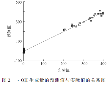 圖2 為PEF 體系中·OH 生成量的預測值與實驗值的關系圖。預測值是由建立的模型求得的響應值,實驗值是實際測實的結果。由圖2 可知,預測值與實驗值十分接近,分布在直線Y = X 附近,表明二次模型能很好的預測的·OH 生成量。