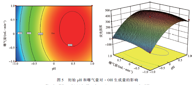 圖3 顯示了初始pH 與反應時間對·OH 生成量的影響。從圖3 可以看出,在反應時間一定時,·OH生成量隨著初始pH 的增大,呈先增大后減小的趨勢;當初始pH 一定時,響應值隨反應時間的延長,先快速增加后趨于平緩。這可能是由于,pH 較高時,Fe2 + 與Fe3 + 會生成難溶的絮體,大大減弱芬頓反應的效率; 在pH 在2. 5 ~ 5. 0 時, Fe3 + 主要以Fe(OH)2 + 的形式存在,在紫外光的照射下,Fe(OH)2 + 能夠迅速的生成Fe2 + 和·OH,加強了芬頓反應,生成大量的·OH;在較低pH 時,Fe(OH)6^3-是Fe3 + 的主要存在形式,Fe(OH)6^3-對紫外光沒有吸收,很難轉換為Fe2 + 與H2 O2 反應生成·OH,且H + 會捕獲大量的·OH。在初始pH 一定時,隨著反應時間的延長,·OH 的生成量會快速增加,而在反應后期,底物濃度降低,·OH 的生成量會趨于平緩。圖3 中的等高線圖呈橢圓型,表示pH 與反應時間的交互作用對響應值的影響顯著;響應曲面圖顯示,響應值隨著初始pH 變化的曲率比隨反應時間變化的大,表明pH 對響應值的影響大于反應時間響應值的影響;在pH4 ~ 6,反應時間90 ~ 140 min 時,·OH 生成量最大。圖4 顯示了,在初始pH 一定時,響應值隨電流密度的增大而增大,這種現象在EF 中較常見 ,可能是由于隨著電流密度的增加, 陰極H2 O2 的生成量增加,從而導致芬頓反應中羥基自由基產量的增加。從圖4 中可以看出,pH 的顯著程度大于電流密度;在pH 4 ~6,電流密度6. 5 ~ 10 mA·cm - 2 條件下,·OH生成量最大。從圖5 中可知,在初始pH 一定時,響應值隨曝氣量的增大,先明顯增大后稍微減弱,這種現象可能是由于隨曝氣量的增大,O2 量增加,有利于H2 O2 的生成,但當O2 飽和時,增加曝氣量并不能增加·OH 生成量。圖5 顯示,pH 的顯著程度大于曝氣量;在pH4 ~ 6,曝氣量1 300 ~ 1 800 mL·min - 1 條件下,·OH生成量最大。圖6 顯示,響應值與反應時間、電流密度均呈正相關,但反應時間比電流密度顯著;響應值在反應時間90 ~ 140 min,電流密度6 ~ 8 mA·cm - 2 時,可取最大值。從圖7 可以看出,反應時間與曝氣量對響應值的交互作用顯著,響應值與反應時間和曝氣量正相關,其中響應值對反應時間的變化比對曝氣量的變化敏感;在曝氣量1 400 ~ 1 800 mL·min - 1 ,反應時間120 ~ 140 min,響應值最大。圖8 中的等高線接近圓形,表明電流密度與曝氣量對響應值的交互效應不顯著;而響應曲面圖顯示,響應值與電流密度和曝氣量正相關;在曝氣量1 400 ~ 1 800 mL·min - 1 ,電流密度6. 5 ~ 8. 5 mA·cm - 2 條件下,響應值最大。