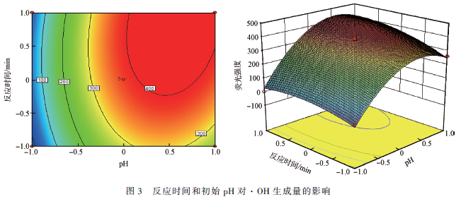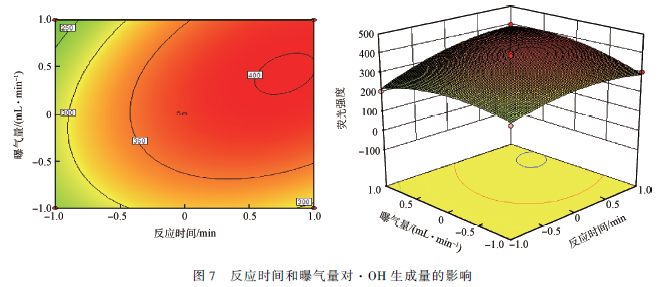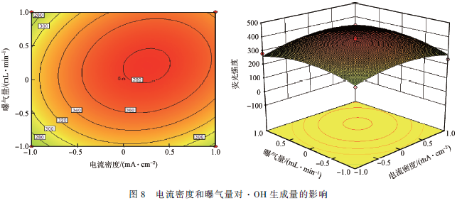 2)響應曲面分析結果顯示,4 因素對·OH 生成量的影響大小為:pH > 反應時間> 電流密度> 曝氣量,且4 因素兩兩之間均存在一定的交互作用,其中反應時間與pH 和曝氣量之間的交互效應尤為顯著。