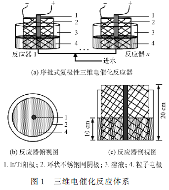 序批式復極性三維電催化反應器如圖1 所示。反應器是由有機玻璃制成的圓柱狀容器,內徑8 cm,有效容積為500 mL。采用直流穩壓電源供,外加電壓為9. 9 V。陽極為鈦基鍍銥Ir/ Ti 柱狀電極( Φ8 mm × 20 cm),陰極為不銹鋼網環狀電極(Φ8 cm ×20 cm),采用以陽極為中心、陰極環圍陽極的電極型式,陰陽極電極間距為4. 24 cm。粒子電極采用自制的Fe/ Fe2 O3 / Fe3 O4 / AC 顆粒狀電極,粒子電極填充比例為60% 。電催化實驗在25 ℃ 、1 atm 條件下進行,電解液為0. 1 mol · L - 1 NaCl + 100 mg · L - 1BTH。進水通過蠕動泵由反應器下部進水,上升流速為8. 333 mL·min - 1 ;采用重力排水的方式。進水、電催化和排水通過時間繼電器自動控制,具體運行參數如下:進水30 min,電催化3 h,排水10 min,每個周期3 h 40 min,1 d 運行6. 5 個周期。