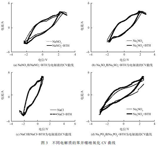 本實驗采用循環伏安法初步探討不同種類電解質對苯并噻唑氧化作用的影響。反應體系分別以0. 1mol·L - 1 的Na2 SO4 、NaCl、NaNO3 和Na3 PO4 為支持電解質,分別掃描未加入苯并噻唑和加入苯并噻唑時的循環伏安曲線,結果如圖3 所示。
