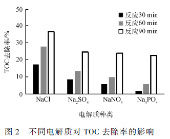 在電催化降解實驗中,一定濃度的支持電解質往往會被加入到廢水溶液中以提高導電能力,不同種類的電解質對電催化體系的效果有一定的影響。實驗采用Na2 SO4 、NaNO3 、NaCl 和Na3 PO4 4 種電解質進行苯并噻唑的電催化降解實驗,通過比較電催化反應的TOC 去除率考察電解質種類對苯并噻唑的去除效果,其結果如圖2 所示。當NaCl 為電解質時,苯并噻唑的去除率最高。理論上來說,在溶液存在Cl - 的情況下,電催化過程中生成了HClO、ClO - 起到了一定的氧化作用;首先,Cl - 在電場作用下向陽極進行定向移動并在陽極表面生成Cl2 :2Cl - - 2e - →Cl2 ;隨后氯氣溶于水生成次氯酸:Cl2 + H2 O→HClO + H + + Cl - ;次氯酸進而水解生成ClO - 和H + :HOCl↔ClO - + H + ,其中HClO 和ClO - 均具有一定的氧化能力,對苯并噻唑及其中間產物可以起到間接氧化的作用,所以當NaCl 作為電解質時,溶液礦化度較高。當以Na2 SO4 、NaNO3 和Na3 PO4 作電解質時,溶液礦化程度均不高,隨著時間的延長三者的TOC 去除率大致相同,說明該3 種電解質在苯并噻唑的電催化氧化過程中起到的作用相近;其中,以Na2 SO4 作為電解質時,TOC 的去除率略高于另兩者,可能的原因主要是在SO4^2- 存在的情況下電解產生了氧化物S2 O8^2- 起到了一部分間接氧化的作用。
