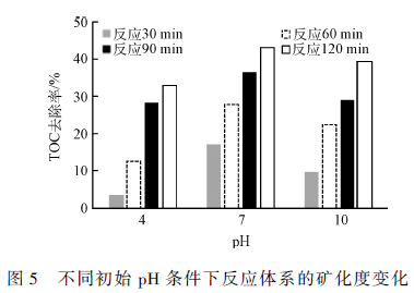 溶液的pH 同樣對電催化降解的效果起著重要的作用,它可能直接影響電極的電催化性和電催化反應過程。利用鹽酸和NaOH 調節電解液的pH 在不同酸堿度下考察反應體系的礦化程度,實驗結果如圖5 所示。