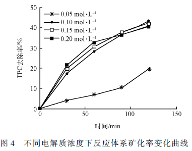 實驗分別對電解質NaCl 濃度為0. 05、0. 1、0. 15和0. 2 mol·L - 1 的反應體系礦化程度進行了分析對比。本實驗選取NaCl 作為電解質的主要原因是其促進了反應體系的礦化過程并且不影響對苯并噻唑降解產物的檢測和分析(苯并噻唑不含有Cl 元素)。通過對2 h 的電催化反應進行取樣測定分析,得到不同電解質濃度時反應體系的TOC 去除情況,如圖4所示。通過總體趨勢可以看出,電解質濃度越高反應體系的礦化效果越好,這是因為電解質濃度增高使反應體系的導電率升高有助于電催化反應的進行。但是,當電解質濃度超過0. 1 mol·L - 1 時,隨著電解質濃度的增加TOC 去除率升高的效果不明顯,從節約成本的方面考慮,電解質濃度不宜超過0. 1mol·L - 1 。此外,隨著電解質濃度的增加局部的TOC 去除率有下降的現象出現,這個是由于電解質離子之間的相互作用增強,導致電導率下降,并且過多的電解質可能會大量吸附于電極表面,阻礙了有機分子與電極表面的接觸,也阻礙了羥基自由基的產生。所以,最佳的電解質NaCl 濃度為0. 1 mol·L - 1 。
