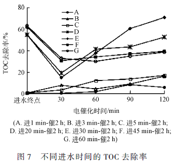 可以看出,所有進水時間方案在停止進水后電催化反應30 min 時,苯并噻唑幾乎完全降解,去除率均在92% 以上。其中,進水30 min-電催化2 h 的時間方案在這一時刻苯并噻唑的去除率達到100% ,說明該方案對于苯并噻唑的降解效果較好。根據HPLC 的檢測結果得知,苯并噻唑在反應過程中并沒有完全礦化成無機物,產生了一些中間產物,所以還需要對不同進水時間方案的礦化度進行測定分析。不同進水時間的TOC 去除率隨時間的變化情況如圖7 所示。