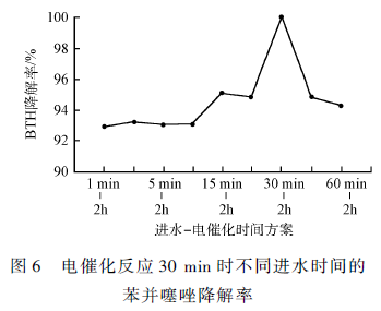 該實驗在不同的進水時間、相同的電催化反應時間內進行,通過苯并噻唑的降解率和反應體系的礦化 程度判斷最佳的進水時間。先在不外加電壓的情況下進行一定時間的進水過程,在達到預定的進水時間后進行2 h 的電催化實驗,使得電催化反應后的出水礦度高、苯并噻唑的電催化降解率高。通過控制上升流速使得進水時間分別達到1、3、5、20、30、45 和60 min。進水終止后進行電催化反應30 min 時,不同進水時間的苯并噻唑降解率結果如圖6 所示。