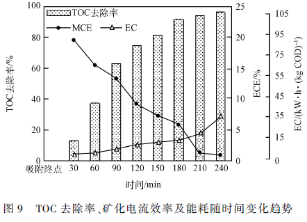 進水30 min 后開始4 h 的電催化實驗,每30 min取樣測定TOC、HPLC、COD 和電流It ,進行3 組平行實驗,實驗結果取平均值。苯并噻唑的濃度變化及去除率如圖8 所示,結果顯示在電催化反應進行30 min時苯并噻唑已經完全被降解。電催化反應的TOC 去除率、礦化電流效率以及能耗隨時間的變化情況如圖9 所示。結果表明,隨著催化實驗的進行,TOC 去除率不斷升高,反應體系在3 h 時便幾乎達到完全礦化的程度,礦化率約為92. 0% ;同時,礦化電流效率較高為5. 99% ,反應所需的電能較少,能耗為13. 00 kW·h·(kg COD) - 1 。在電催化反應3 h 以后,TOC 去除率的提高速率減緩,而礦化電流效率迅速下降到1. 06% ,且電能損耗大幅增加高達29. 20kW·h·(kg COD) - 1 ,造成這一現象的主要原因有:(1)在電催化反應后期,反應體系中存在的有機污染物的濃度已經很低了。此時的反應速率常數小于羥基自由基催化反應的平衡常數,不利于反應的正向進行,所以降解速率較慢、電流效率低,為推動反應的繼續正向進行需要消耗更多的電能;(2)隨著反應的不斷進行,反應體系中可能生成了更難被氧化降解的中間產物,較多的副反應出現,也會造成處理效率不高、電能損失大。對反應過程中TOC 和苯并噻唑的測定值進行誤差分析,結果顯示3 次實驗的測定值具有較高的一致性,絕對誤差在0. 08 ~ 0. 12 之間,說明三維電催化體系的運行穩定性較好。